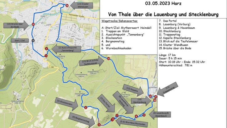 Diese führte uns zum Aussichtspunkt "Tannenberg", mit herrlicher Aussicht über Thale und zur Rosstrappe, weiter am Begräbnisforst vorbei zum Glockenstein. Von hier ging es bergab zum Wurmbach mit den herrlichen Wurmbachkaskaden. Aus dem Tal heraus ging es hinauf Lauenburg, erst zur Vorburg und dann zur Hauptburg mit dem magischen Hexenbaum. Nach der ersten Burgruine ist vor der nächsten Burgruine, in diesem Fall die Stecklenburg. Über den Treppenstieg ging es hinunter nach Stecklenberg und dann entlang herrlicher Obstwiesen zurück nach Thlae. Zwischendurch gab es einen schönen Blick auf die Teufelsmauer, unserem Ziel am Tag 3. In Thale machten wir noch einen Abstecher zum Kloster Wendhusen.