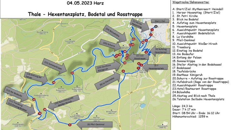 Abschließend stiegen wir von der Rosstrappe über den Präsidentenweg, vorbei an der Bülowhöhe und und der Quellhöhle nach Thale ab. Das letzte Stück ging an der Bode entlang bis zur Talstation der Seilbahn Thale-Hexentanzplatz, der Hubertusinsel und über den Friedenspark zurück zum Hotel.