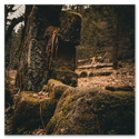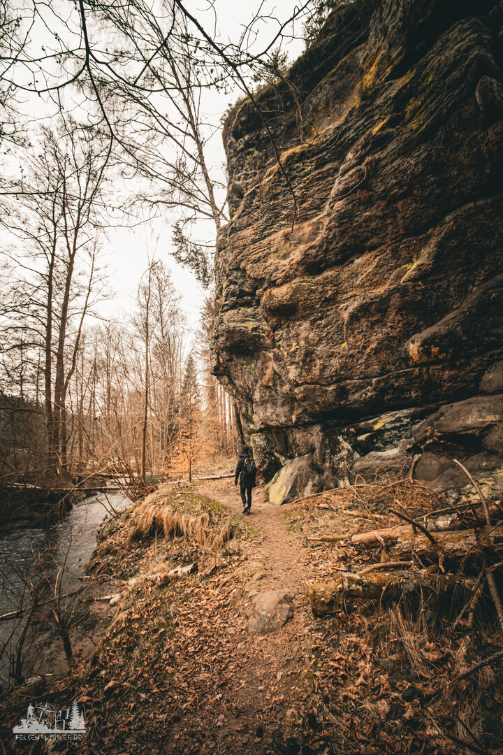 Wenn man den höchsten Punkt erreicht hat geht es rechts in den Wald hinein und nach ein paar Metern auf eine Lichtung, die durch Baumfällungen entstand, bevor sich rechts um einen Felsen der Blick ins tiefe Tal ergibt. Von diesem Zeitpunkt geht es steil bergauf in die Schlucht der Kamnitz. Unten am breiten Wanderweg angekommen, gingen wir nicht direkt zur Dolsky Mlyn (Grundmühle) sondern erst einmal rechts, dem Wanderweg folgend. Nach paar Gehminuten kann man rechts alte Mauerreste erkennen. Hierbei soll es sich um eine alte Töpferei handeln, auch der Zugang zum Keller/Höhle ist noch erkennbar. Die Ruine bietet auch ein paar schöne mystische Fotomotive.