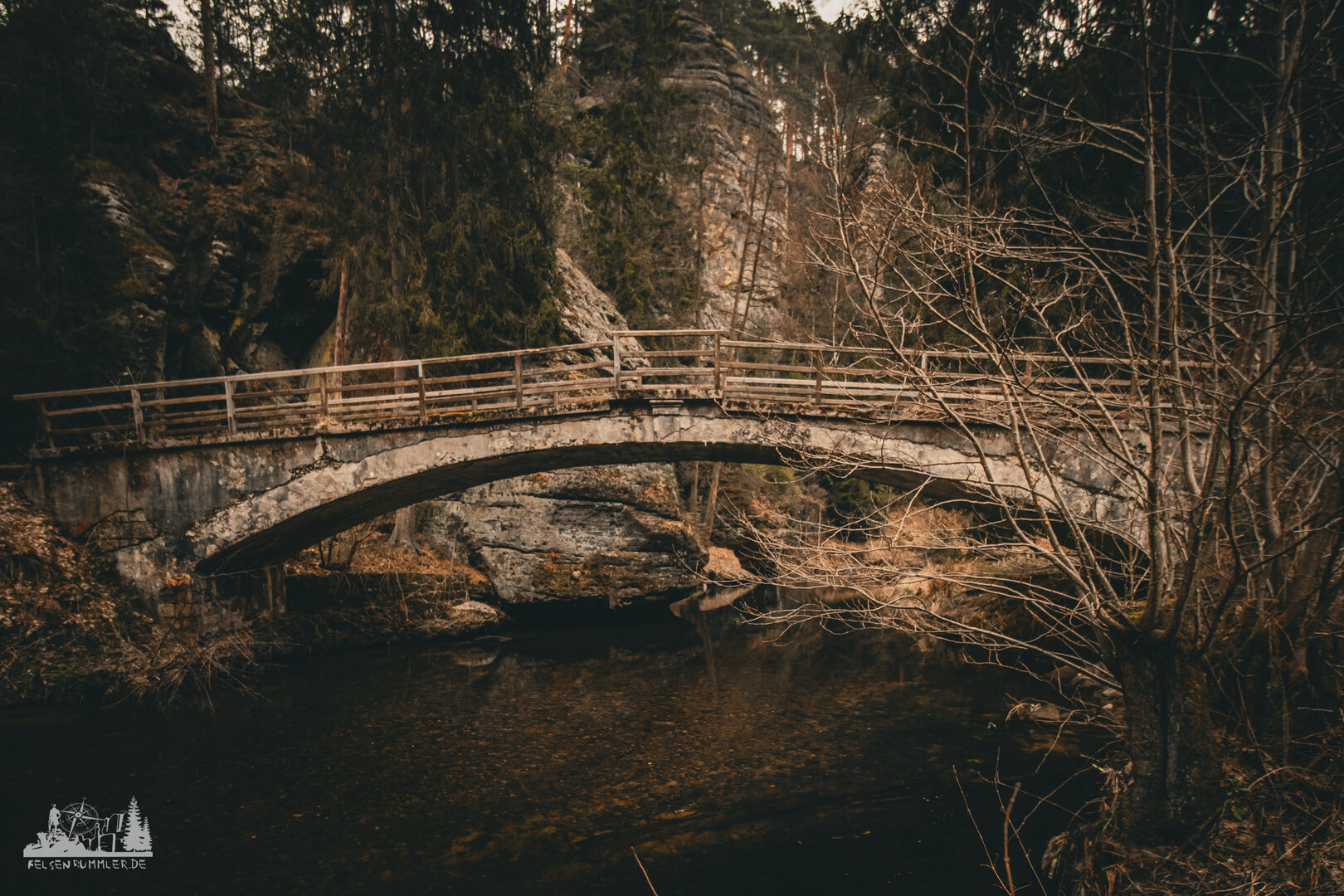 So die Übersetzung der Inschrift, etwas gruselig anzuschauen, aber naja. Der Weg führt weiter über eine schöne Brücke über die Kamnitz, links etwas an ihr entlang. Kurz nach einer Holzbrücke gehts es über Sandsteinstufen den Fels hinauf und auf schmalem Pfad den Flussentlang, bevor man auf der anderen Seite wieder über Stufen und Eisenklammer runter muss. Nun sieht man schon die steinernen Überreste der Grundmühle. Eine Brücke für wieder über die Kamnitz und ich muss sagen der kleine Umweg hat sich gelohnt.