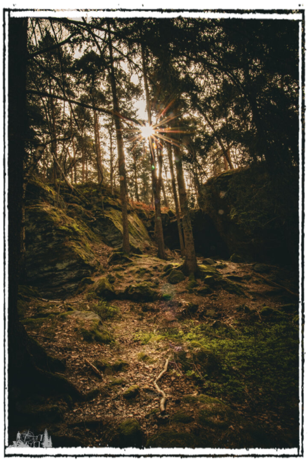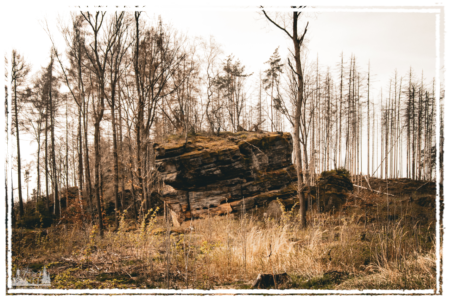 ) Richtung Giesensteine ab. Die Giesensteine sind eine kleine Felslandschaft mitten im Wald und hätte man wegen dem Borkenkäfer nicht die Bäume fällen müssen, würde alle daran vorbei laufen. So ragt aber der vordere Giesenstein so heraus, das man Lust hat das Areal zu erkunden. Hinter dem vorderen Fels befindet sich eine Felswand, an der es sogar eine Boofe (wahrscheinlich nicht offiziell) gibt. Aber einige Übernachtungsgäste haben es übertrieben, denn über der Feuerstelle ist der Fels rußschwarz. Irgendwo soll es auch eine Höhle geben, die ich aber nicht gefunden habe.