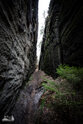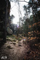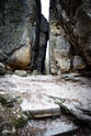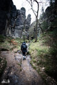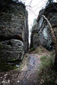 ) bis zur Robert-Sterl-Straße, der wir nach links folgten bis zum Beginn des "Hintergrundes". Dieser führt nun weiter bergauf bis die ersten Felsen erscheinen. Links befinden sich die Felsen um den den sogenannten "Knöchel", welchen wir uns kurz näher anschauten. Direkt gegenüber vom Abzweig "Knöchel" befindet sich ein kleiner Pfad, der um einen Felsvorsprung direkt in die Schlucht von "Khan", "Conradturm" und Co. führt.