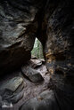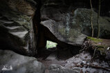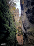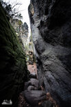 Am Ende des Rauensteins geht es rechts in den Wald. Abseits des Wanderweges geht es durch eine Felsengasse hindurch in den Bärengrund. Linker Hand liegt noch eine Boofe. Im Grund geht es dann wieder rechts zum "Dreifreundestein" hoch und durch einen schmalen Felsdurchgang hindurch. Der Wald ist düster und die schwarzen Felswände ragen hoch auf, sind jedoch durch tiefe Spalten zerklüftet. Nur ein paar Meter weiter plötzlich ein völlig anderes Bild. Birken, die noch ohne ihr Blätterkleid sind lassen Licht auf die Felsen fallen, wo durch der Sandstein nun wieder hell strahlt. Hier ist das Rauensteintor auf der linken Seite und eine dunkle Felsengasse auf der rechten Seite. Diese Gasse führt zum Bärengrund und man kann auf den Rauenstein und die Bärengrundbrücke blicken. Ob der Weg durch geht, konnte ich nicht feststellen - lt. Komoot ja.