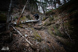 Natürlich haben wir uns auch beim weiteren Abstieg wieder verlaufen bzw. den Weg vor lauter Bäumen nicht gesehen und sind dann zwischen zwei Felsen eine Spalte hinunter geklettert, eher mehr auf dem Hosenboden gerutscht - im nachhinein war es der richtige Weg lt. Komoot.