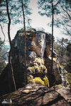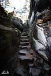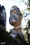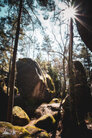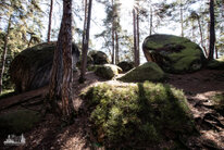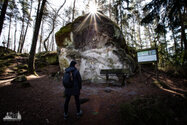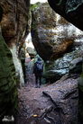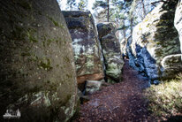) Wandermarkierung bis man plötzlich mitten Wald auf Sandsteinfelsen trifft, aber nicht nur ein, zwei wie auf den Sokol, sondern beim weiteren Gehen erschließt sich eine komplette Felsenstadt. Der Wanderweg führt durch enge Felsgänge und -spalten, Stufen hinauf, Stufen runter und an jeder Ecke gab es neue Felsformationen zu bestaunen.