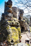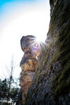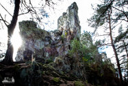 ). In knapp 2 Kilometern überwanden wir rund 280 Höhenmeter um den Gipfel Sokol zu erreichen. Zwischendurch hatten wir einen fantastischen Fernblick über Mala Skala mit der Burg Frydstejn und Burg Vranov und der malerischen am Fels lehnenden Kapelle. Dann ging es durch dichten Wald, über Felsstufen und Serpentinen hinauf auf 562m. Nach dem sich der Wald lichtet steht man plötzlich vor skurrilen Sandsteinnadeln. Der Sokol ist der höchste Gipfel im Jicin-Gebirge und wurde nach, einer im Jahr 1862 durch Miroslav Tyrs gegründeten Sportbewegung benannt. Eine Bronzetafel am Fels erinnert daran. Etwas weiter befindet sich der Aussichtspunkt "vrchol Sokol" mit einen atemberaubenden Blick zu Suché skaly (Dürre Felsen), welche unser letztes Ziel für heute sein werden.