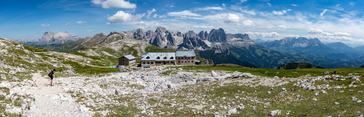 Start war in Seis am Schlern, wo wir mit der Seilbahn hoch nach Compatsch fuhren und dann weiter mit dem Sessellift Panorama, welcher uns bis zum gleichnamigen Hotel brachte. Hier startete unsere Wanderung. Der Weg führte uns erst einmal ganz gemächlich vorbei an der Sattler Schwaige zum Einstieg in die Scharte. Ab hier geht es 500 Höhenmeter steil bergauf. Der Aufstieg erfolgte über die Forcella Denti di Terrarossa (Rosszahnscharte), die mit guter Trittsicherheit und Kondition für jeden machbar ist. Die Aussichten sind einfach großartig. Man hat die ganze Zeit die komplette Seiser Alm mit Puflatsch hinter sich, eingerahmt auf der linken Seite von den Rosszähnen, dem Schlern mit Monte Pez und Santnerspitze und auf der rechten Seite von Raschötz und der Langkofelgruppe. Am höchsten Punkt der Scharte (2499m) blickt man auf der anderen Seite Richtung Rosengartengruppe. Von hier ging es auf der Rückseite der Rosszähne erstmal ein wenig bergab bis zur Tierser Alpl Hütte.