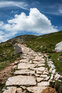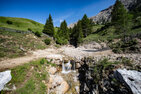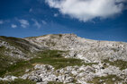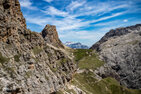 Von der Tierser Alpl Hütte wanderten wir auf dem Panoramaweg, rechts von uns die aufragenden Felsen der Rosszähne und des Schlerns, links das tief eingeschnittene Tal mit dem gegenüberliegenden Rosengartengruppe - einfach atemberaubend. Ab dem Abzweig Bärenloch ging es wieder steil bergauf, hinauf auf das Schlernplateau. Fantastisch war auch der Rückblick zur Tierser Alpl Hütte. Im Aufstieg waren auch schon unserer nächsten Ziele in Sicht, das Schlernhaus und der Monte Pez. Endlich auf dem Plateau angekommen ging es nun recht eben, teilweise bergab und sehr steinig vorwärts Richtung Schlernhaus.