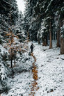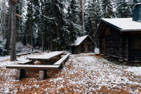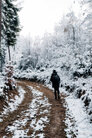 Nach dem wir ausgiebig das Gebiet erkundet hatten wanderten wir weiter auf dem Elstergebirgsweg, vorbei an der kleinen Kapelle und dem Hinteren Kegelberg (755m), bis zum Abzweig, der uns hinunter zur Schwarzbachquelle brachte. Hier machten wir eine Rast und schlürften unsere leckere heiße Kürbissuppe aus der Blockhütte. Nun ging es weiter entlang des Grenzweges, manchmal recht steil bergauf, aber immer auf schmalen Pfaden durch schönen, dichten verschneiten Winterwald.