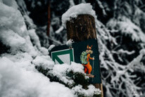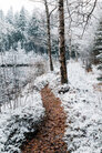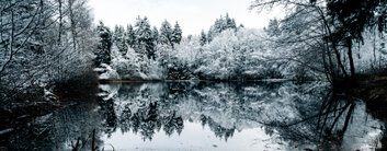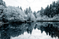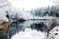 Unsere Wanderung führte uns erst einmal durchs Dorf, ehe wir in den Wald abbogen und alsbald die "Lohe Hof Hütte" erreichten. Ein schöner überdachter gemütlicher Rastplatz am Waldesrand mit einer großen Tafel im Freien. Von hier aus ist es auf dem "Erlebnispfades" nicht weit bis zum "Unteren Wohnzammteich" in dem sich heute wunderbar die verschneiten Bäume spiegelten. Ein Stückchen weiter bergauf liegt, ihr ahnt es schon, der "Obere Wohnzammteich".