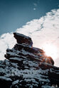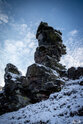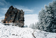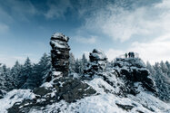Dem Wanderweg ein wenig folgen und schont gluabt man einen Augen kaum. Plötzlich ragt aus dem Wald ein Felsen - der Hohe Stein - empor, er erinnert mich an die kleine Ausgabe des Falkensteins in der Sächsischen Schweiz - an seiner Flanke ragen andere Formationen empor, die Ähnlichkeiten mit den Herkulessäulen im Bielatal haben.