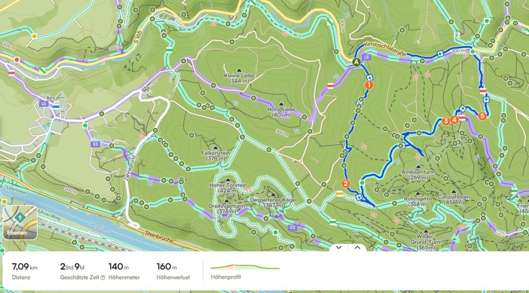 Über den Zeughausweg, der auch total überfroren war gingen wir Richtung Einstieg Wilde Hölle und ich schaute kurz zu den ersten Felspassagen - nein, das müssen wir uns nicht antun - Gesundheit geht vor. Nun führte uns die Untere Affensteinpromenade weiter, vorbei an der Brosinnadel und Bloßstock. Auch der kleine Winterberg war zusehen, dessen Bäume weiß leuchteten. Über den Dietrichsgrund ging es zurück auf die Kirnitzschtalstraße.
