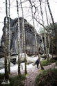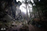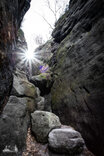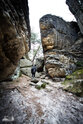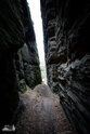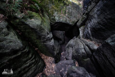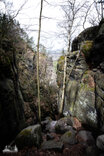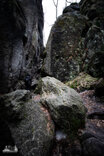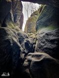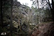 Am Ende des Rauensteins geht es rechts in den Wald. Abseits des Wanderweges geht es durch eine Felsengasse hindurch in den Bärengrund. Linker Hand liegt noch eine Boofe. Im Grund geht es dann wieder rechts zum "Dreifreundestein" hoch und durch einen schmalen Felsdurchgang hindurch. Der Wald ist düster und die schwarzen Felswände ragen hoch auf, sind jedoch durch tiefe Spalten zerklüftet. Nur ein paar Meter weiter plötzlich ein völlig anderes Bild. Birken, die noch ohne ihr Blätterkleid sind lassen Licht auf die Felsen fallen, wo durch der Sandstein nun wieder hell strahlt. Hier ist das Rauensteintor auf der linken Seite und eine dunkle Felsengasse auf der rechten Seite. Diese Gasse führt zum Bärengrund und man kann auf den Rauenstein und die Bärengrundbrücke blicken. Ob der Weg durch geht, konnte ich nicht feststellen - lt. Komoot ja.