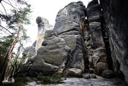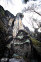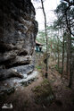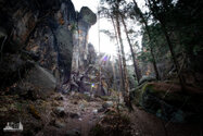 ) bis zur Robert-Sterl-Straße, der wir nach links folgten bis zum Beginn des "Hintergrundes". Dieser führt nun weiter bergauf bis die ersten Felsen erscheinen. Links befinden sich die Felsen um den den sogenannten "Knöchel", welchen wir uns kurz näher anschauten. Direkt gegenüber vom Abzweig "Knöchel" befindet sich ein kleiner Pfad, der um einen Felsvorsprung direkt in die Schlucht von "Khan", "Conradturm" und Co. führt.
