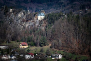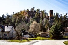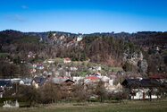 ) wieder zurück zukehren. Nun war es nicht mehr weit bis nach Mala skala (deutsch: Kleinskal). Im Ort blickten wir noch einmal auf Suche skaly, Burg Frydstejn, Burg Vranov und auf den Sokol zurück.