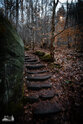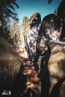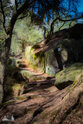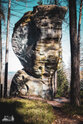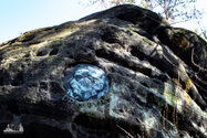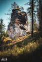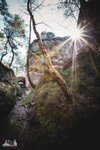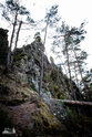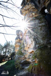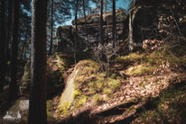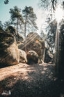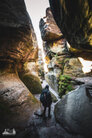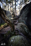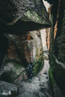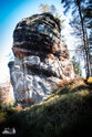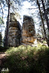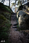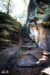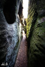 ) Wandermarkierung bis man plötzlich mitten Wald auf Sandsteinfelsen trifft, aber nicht nur ein, zwei wie auf den Sokol, sondern beim weiteren Gehen erschließt sich eine komplette Felsenstadt. Der Wanderweg führt durch enge Felsgänge und -spalten, Stufen hinauf, Stufen runter und an jeder Ecke gab es neue Felsformationen zu bestaunen.