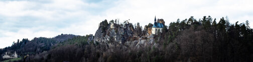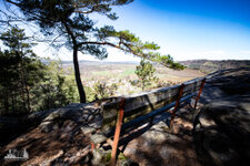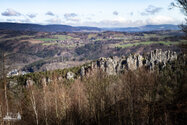 ). In knapp 2 Kilometern überwanden wir rund 280 Höhenmeter um den Gipfel Sokol zu erreichen. Zwischendurch hatten wir einen fantastischen Fernblick über Mala Skala mit der Burg Frydstejn und Burg Vranov und der malerischen am Fels lehnenden Kapelle. Dann ging es durch dichten Wald, über Felsstufen und Serpentinen hinauf auf 562m. Nach dem sich der Wald lichtet steht man plötzlich vor skurrilen Sandsteinnadeln. Der Sokol ist der höchste Gipfel im Jicin-Gebirge und wurde nach, einer im Jahr 1862 durch Miroslav Tyrs gegründeten Sportbewegung benannt. Eine Bronzetafel am Fels erinnert daran. Etwas weiter befindet sich der Aussichtspunkt "vrchol Sokol" mit einen atemberaubenden Blick zu Suché skaly (Dürre Felsen), welche unser letztes Ziel für heute sein werden.