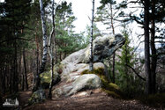 ) geht. Nun geht es steil bergauf auf den Kammweg der zu den Suché skály (deutsch: Dürre Felsen) führt. Immer mehr Felsformationen säumen den Weg bevor man dann endlich vor den eigentlichen Felskamm steht.