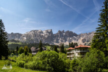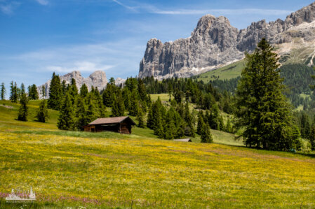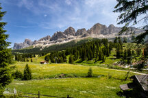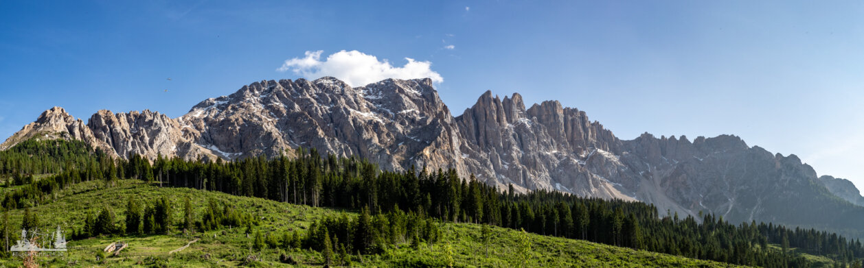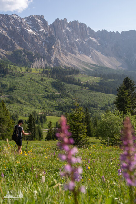 An den Denkmal verließen wir den Hirzelsteig und stiegen zur Paolina Hütte (Refugio Paolina) ab. Hier stärkten wir uns nochmal kurz und setzten den Abstieg zur Talstation. Der Weg führt eine ganze Weil unterhalb der Seilbahn entlang, bis zur Straße, der wir dann bis zum Parkplatz folgten. Hier hatten wir nochmal einen herrlichen Blick zu Rosengarten und Latemar.