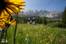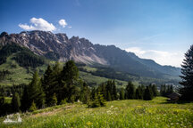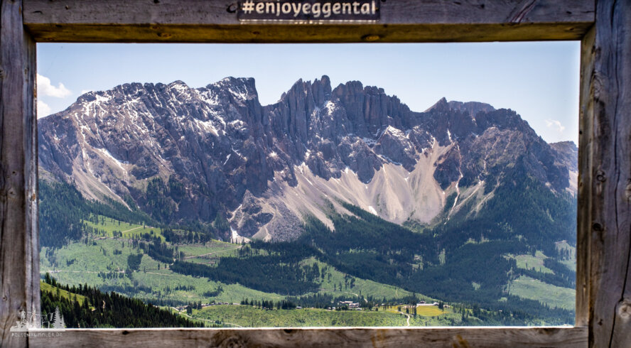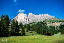 Unser erstes Ziel war der Karer See (Lago di Carezza), zu dem wir erst eine Hängebrücke über- und dann einen Fußgängertunnel durchqueren mussten - hat bloß noch eine Rolltreppe gefehlt, damit die ganzen Turnschuh- und Selfietouristen ja nicht so viel laufen müssen. Hier am See war echt viel los und warum - weil sie im glasklaren blauen Wasser des Sees sich die Latemargruppe so schön spiegelt. Also drehten wir fix eine Runde um den See und verschwanden wieder über die Hängebrücke und wanderten Richtung Kölner Hütte (Refugio Fronza alle Coronelle). Dabei führte uns der Weg vorbei an der Waidmannalm und der Moseralm, immer im Blick auf der einen Seite der Rosengarten, auf der anderen Latemar. Ab der Jolanda Alm ging es dann bis zur Kölner Hütte richtig steil bergauf, insgesamt überwanden wir 500 Höhenmeter (von 1830m auf 2337m).