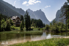 Der See liegt auf rund 1260 m und gehört zum Naturpark Fanes-Sennes-Prags. Die Rienz, die an den Drei Zinnen entspringt bilden den Zu- und Abfluss. Der Weg um den See beträgt ca. 4,5 Kilometer und es gibt. einen Naturlehrpfad. Von Toblach aus kommend befindet sich auf der rechten Seite ein Restaurant, mit Boot und Wassertreterverleih sowie etwas weiter hinten ein Strand zum Baden. Es befindet sich auch auf dieser Seite eine kleine Aussichtsplattform.