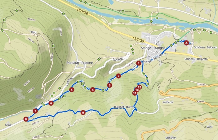 Unsere Wanderung startet in Stange, vom Parkplatz am Sportzentrum und führt uns entlang des Ratschingsbaches über die Hauptstraße und weiter, vorbei am Abzweig Burgruine Reifenegg, bis zum Eingang/Kassenhäuschen Gilfenklamm.